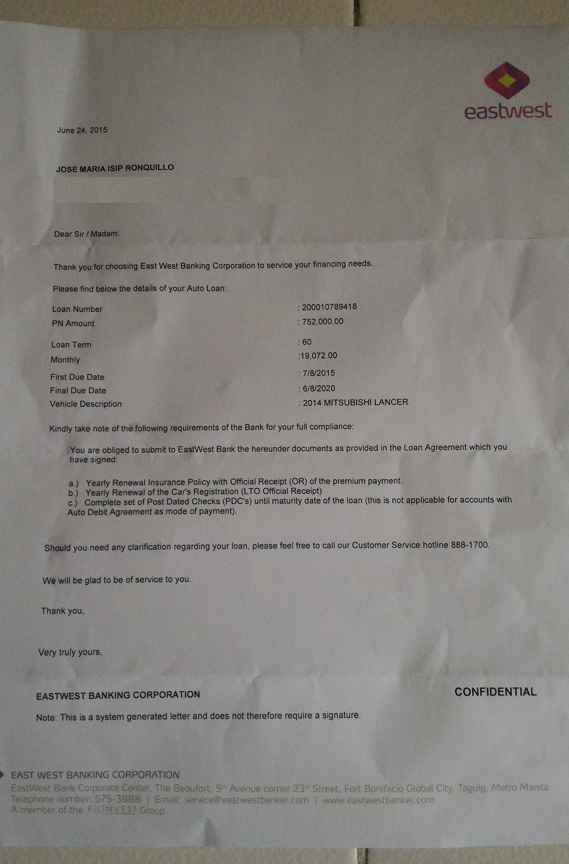 EastWest Bank I got a letter and some documents indicating my monthly payment for a car loan that I never applied for. I never got any Mitsubishi Lancer 1.6 MX from Union Motors Edsa. I have never made any transaction with your bank. No loans, no savings account, not even once I stepped inside one of your branches to make a simple deposit.