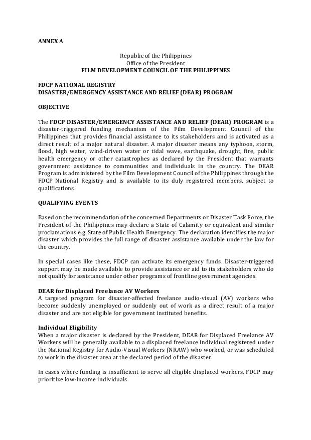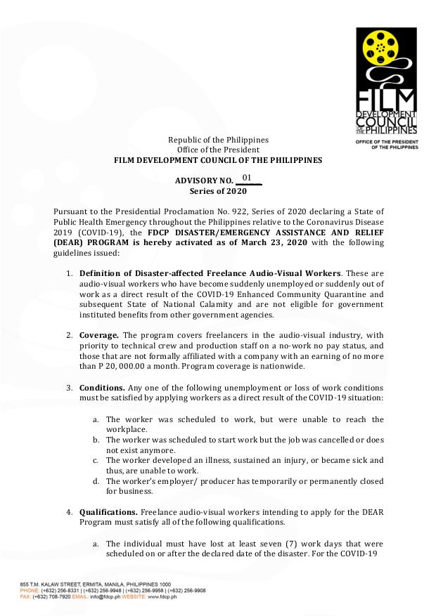 - Application Process. Relative to the COVID-19 situation, applications may be submitted to FDCP from March 23 – April 23, 2020 or within 30 days of the activation of the DEAR Program through this Advisory. Online submissions via email to [email protected] are preferable and hard copy applications are discouraged. However, drop boxes for DEAR applications will still be available at the FDCP Office at 855 T.M. Kalaw Street, Ermita, Manila starting March 23, 2020.
