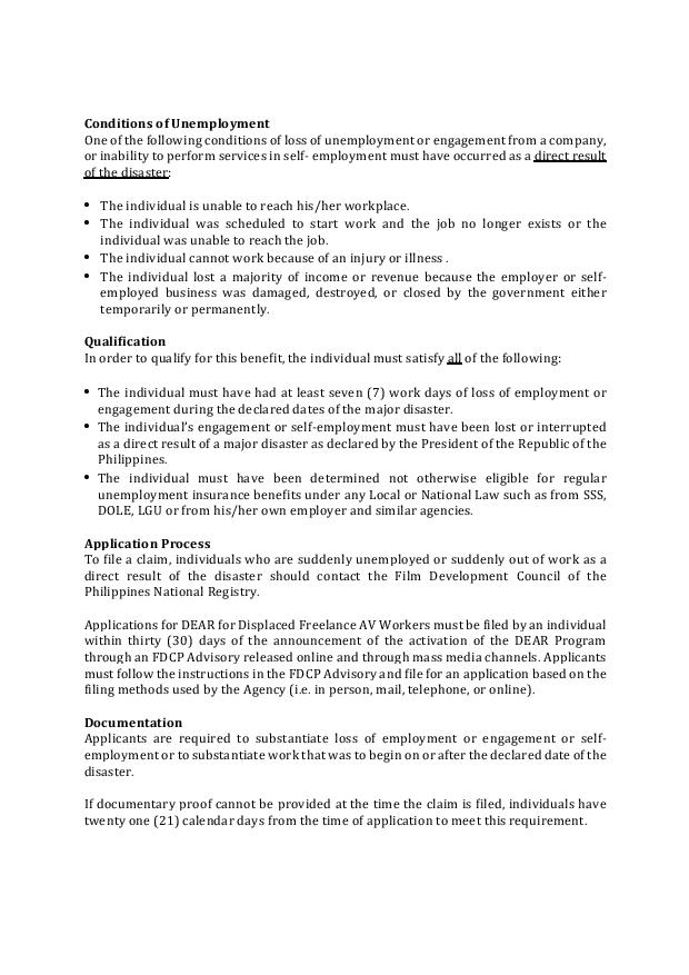 - Documentary Requirements. Freelance audio-visual workers who intend to apply are required to substantiate loss of employment or self-employment or to substantiate work that was to begin on or after the declared date of the disaster. The following documents shall be submitted by each applicant: