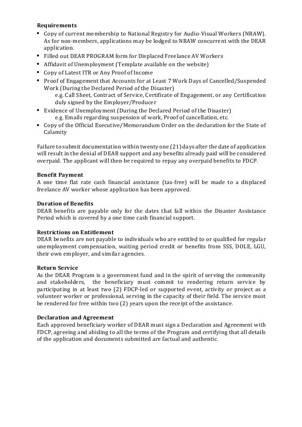- Benefit Payment. Approved beneficiaries of the DEAR Program for Freelance AV Workers will receive a one time cash financial assistance of Eight Thousand Pesos (P 8, 000) tax free to cover expenses during the disaster period, like personal needs, medical expenses, housing and rent, and other essentials. The beneficiaries will be required to sign a Declaration and Agreement with FDCP agreeing and abiding to all the terms of the Program and certifying that all details of the application and documents submitted are factual and authentic.