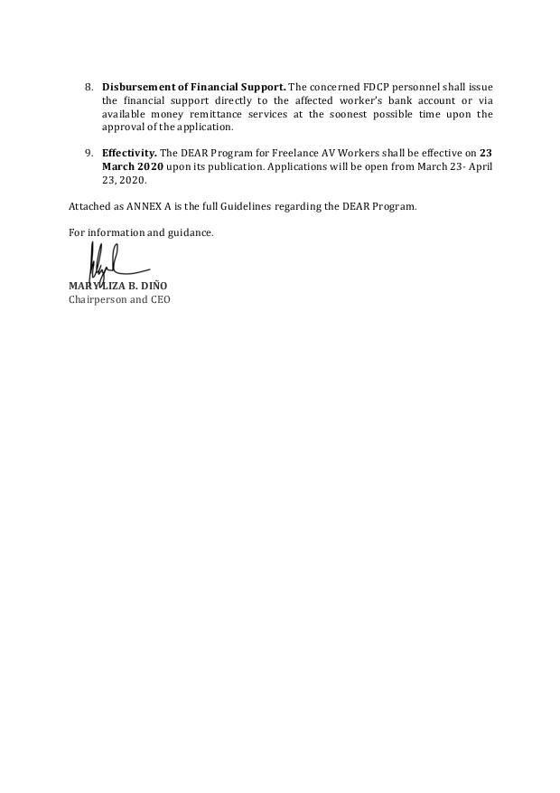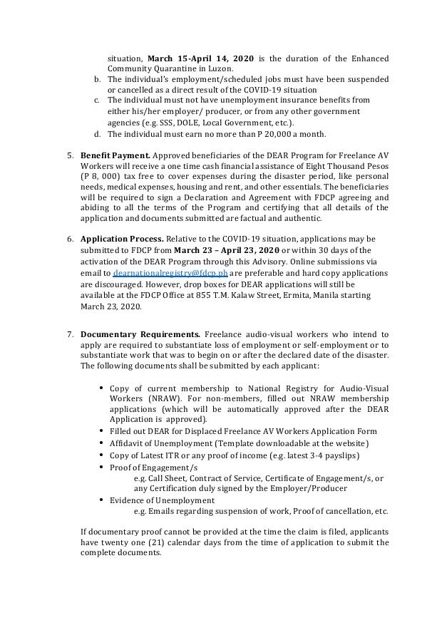 - Effectivity. The DEAR Program for Freelance AV Workers shall be effective on 23 March 2020 upon its publication. Applications will be open from March 23- April 23, 2020.