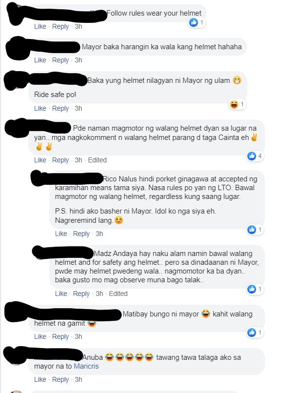 Nakakahiya sa mga comments meron pa mga ng bash doon sa ng bibigay lang concern sa kay Mayor Kit in wearing ang helmet. Dahilan kasi nasa bayan lang naman eh. Kasi ginagawa ng Mayor namin so ok lang na gayahin namin sya. Wala naman naghuhuli sa bayan ng walang helmet. Ok lang angkas ang bata ng walang helmet. Ok lang naka tsinelas at naka shorts. Nakakaawa yung tao na bash ng iba dahil lang sa pagalala na wala helmet si Mayor Kit at dapat nagsuot ito to be a role model.