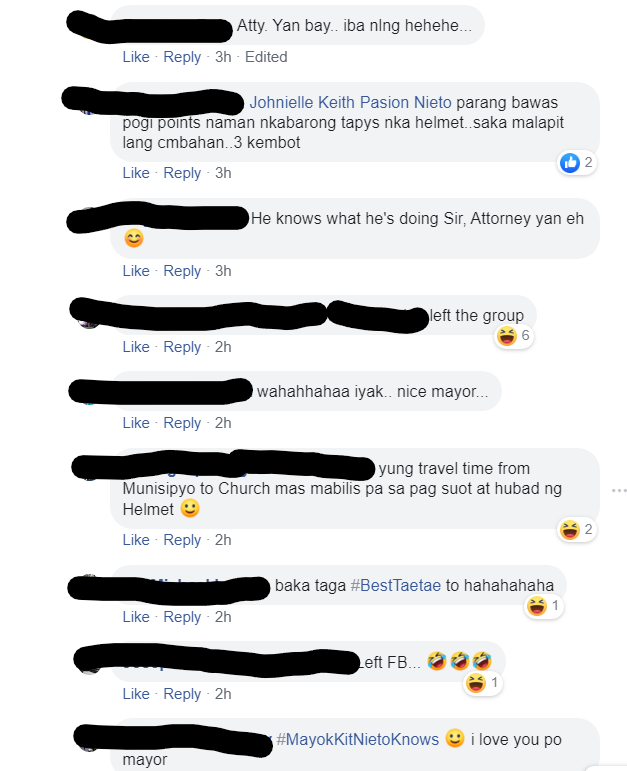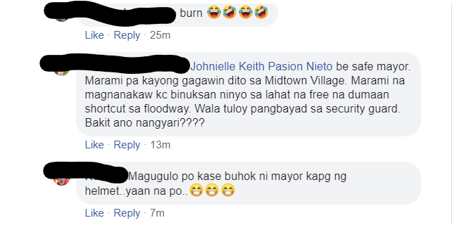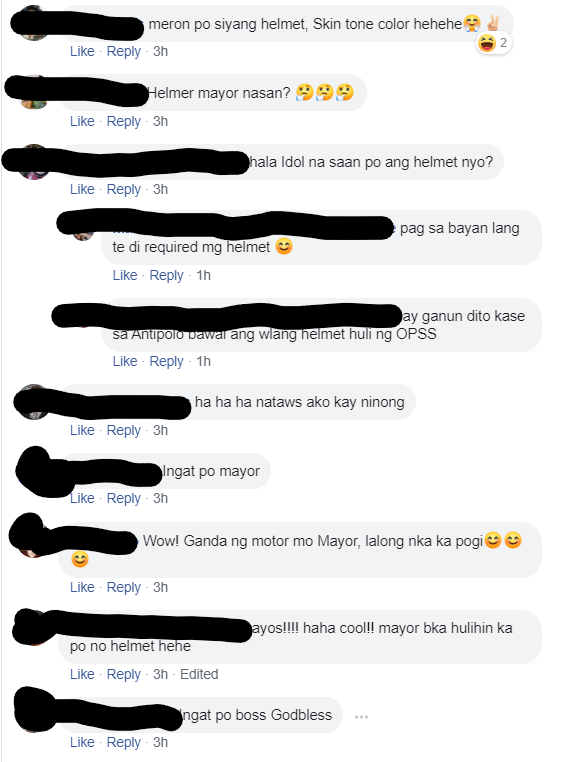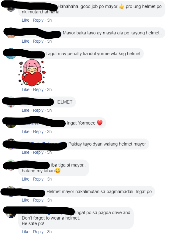 Ako na dismaya nung nakita ko post ni Mayor Kit na hindi naka helmet. Follow ko Major Kit page to be updated sa mga projects at activities ng Cainta. Pero itong pag post ng walang helmet naging usap usapan ng mga taga Cainta. Sa comment thread nito meron mga nag-alala at nagbibilin na maghelmet sya kundi huhulihin sya ng mga TMG at para sa kaligtasan nya.